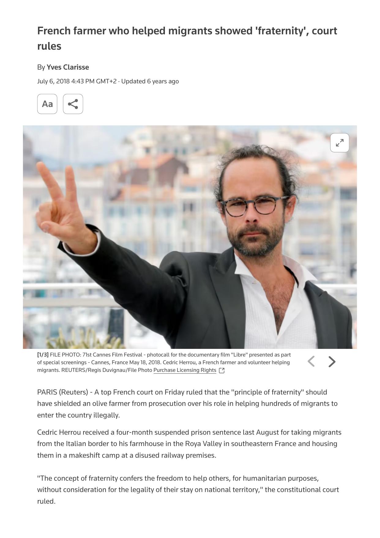 French farmer who helped migrants showed 'fraternity', court rules (518)